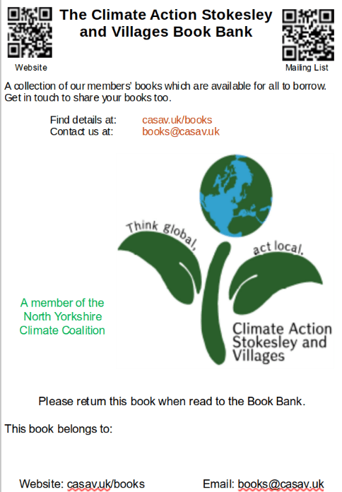 Books – The Climate Action Stokesley and Villages Book Bank is now up and running, you can find all the details on https://casav.uk/books. Currently the books are moving around, we are looking into options of keeping the books possibly at the Globe. There are also details of how you can share your books as part of the CASaV Book Bank. Simon will look into whether the books could be hosted by the library. Of course don’t forget to search our local libraries catalogues to see if they have a book you are interested in, while they don’t have a huge collection of physical books these are complemented by e-books, plus we can ask them to purchase books we think would be appropriate.