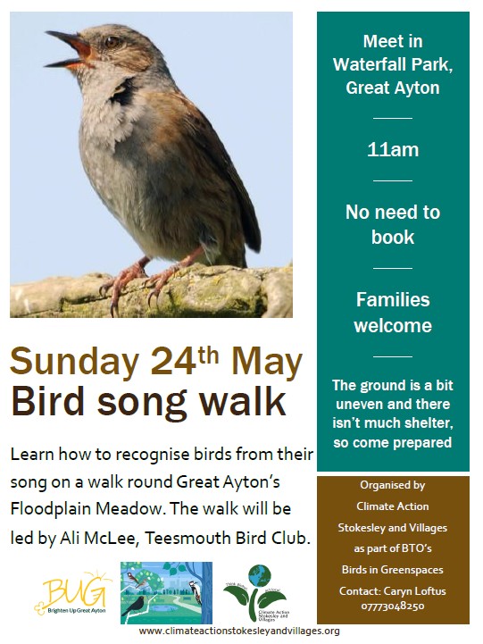 Meet at 11am in Waterfall Park, Great Ayton (opposite Suggitts on the High Steet). The walk is less than a mile but the ground is a bit uneven and there isn’t much shelter from sun or rain so come prepared.