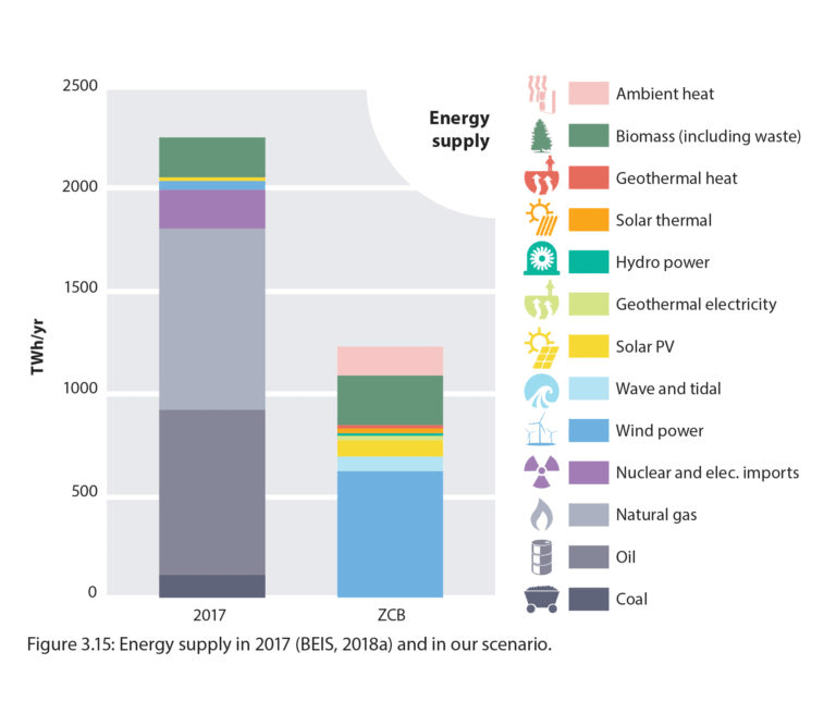 Power-up: CAT-ZCB envisions 100% renewable and carbon neutral energy sources. The plan shows how generation of renewable electricity can fulfill 100% of the UK’s energy needs, when combined with carbon neutral synthetic fuels – using excess electricity to produce hydrogen which is combined with UK carbon biomass, so they are carbon neutral.
