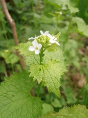 | The Garlic Mustard is early-flowering in hedgerows. It reaches 1m in height. It has heart shaped indented leaves which give off a strong garlic smell when crushed. The flowers are small and white and in clusters. It is the larval foodplant of the Orange-tip butterfly. | |