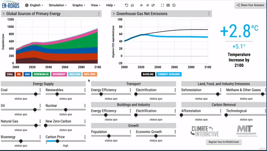 - En-ROADS climate simulator – uses the best science to see what actions get carbon dioxide emissions down and when